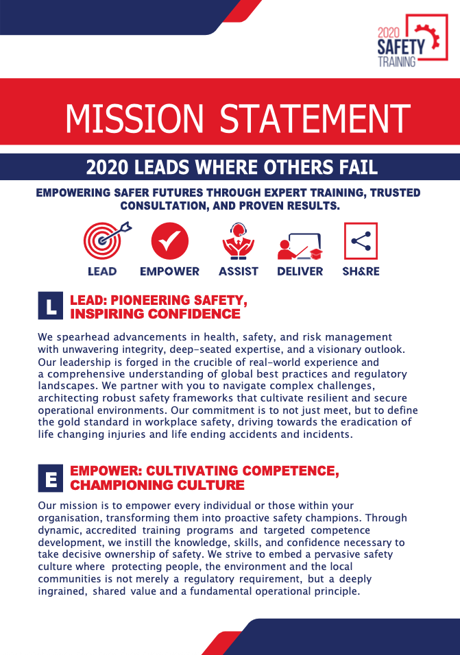 LEAD: Pioneering Safety, Inspiring Confidence At 2020 Safety Training, we don’t just follow standards—we define them. Our leadership is built on a foundation of real-world experience and a comprehensive understanding of global best practices and regulations. Whether you’re an individual seeking to advance your career or a business aiming to enhance your operational integrity, we partner with you to navigate complex challenges and cultivate a robust safety framework. Our commitment is to drive towards the complete eradication of life-changing injuries and fatal accidents, setting the gold standard in workplace safety.