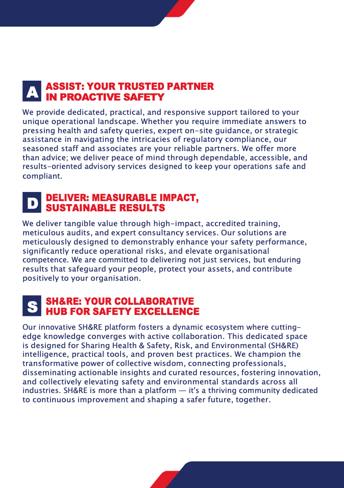 ASSIST: Your Trusted Partner in Proactive Safety We provide dedicated, practical, and responsive support tailored to your unique needs. Our seasoned staff and associates are your reliable partners, whether you need immediate answers to a safety query, on-site guidance, or strategic assistance with regulatory compliance. We go beyond simple advice, delivering peace of mind through dependable and results-oriented advisory services. We are here to assist both individuals on their professional journey and organisations in maintaining safe and compliant operations.